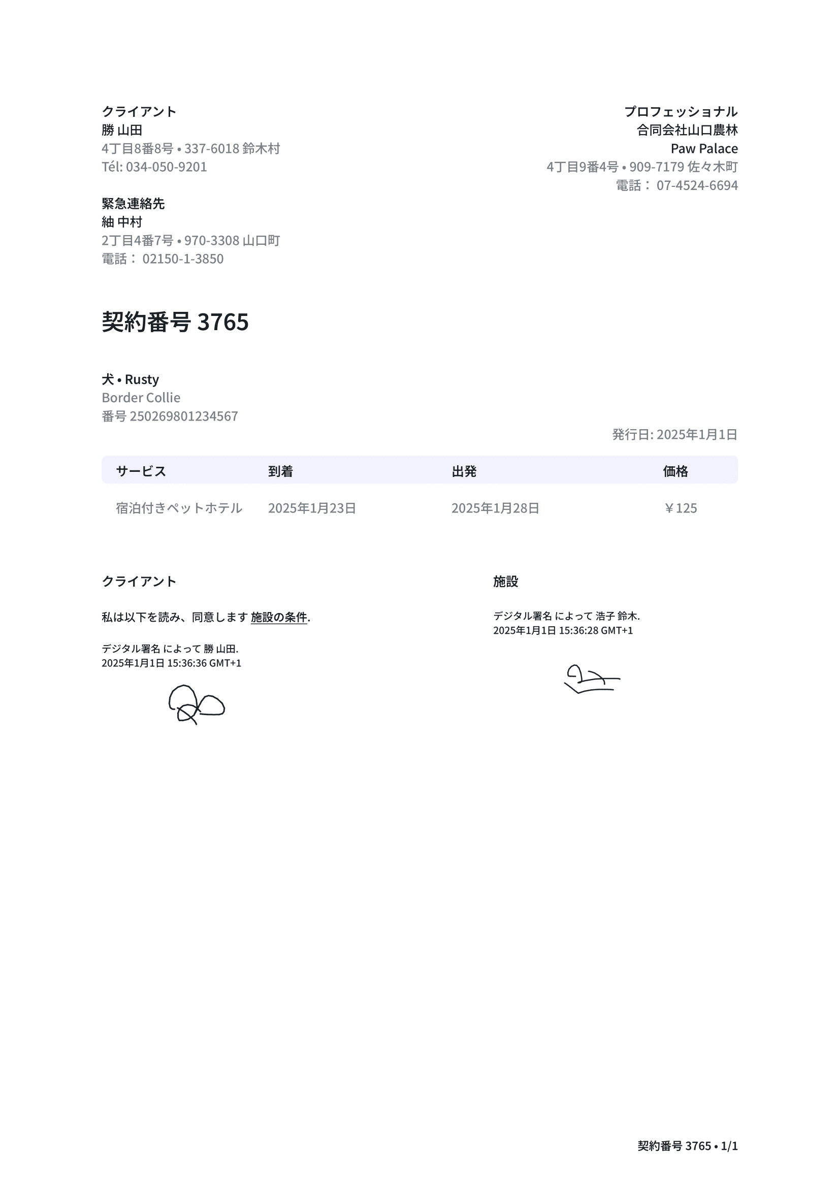 IzyPetは、宿泊ごとにパーソナライズされた予約契約書を簡単に作成できます。
