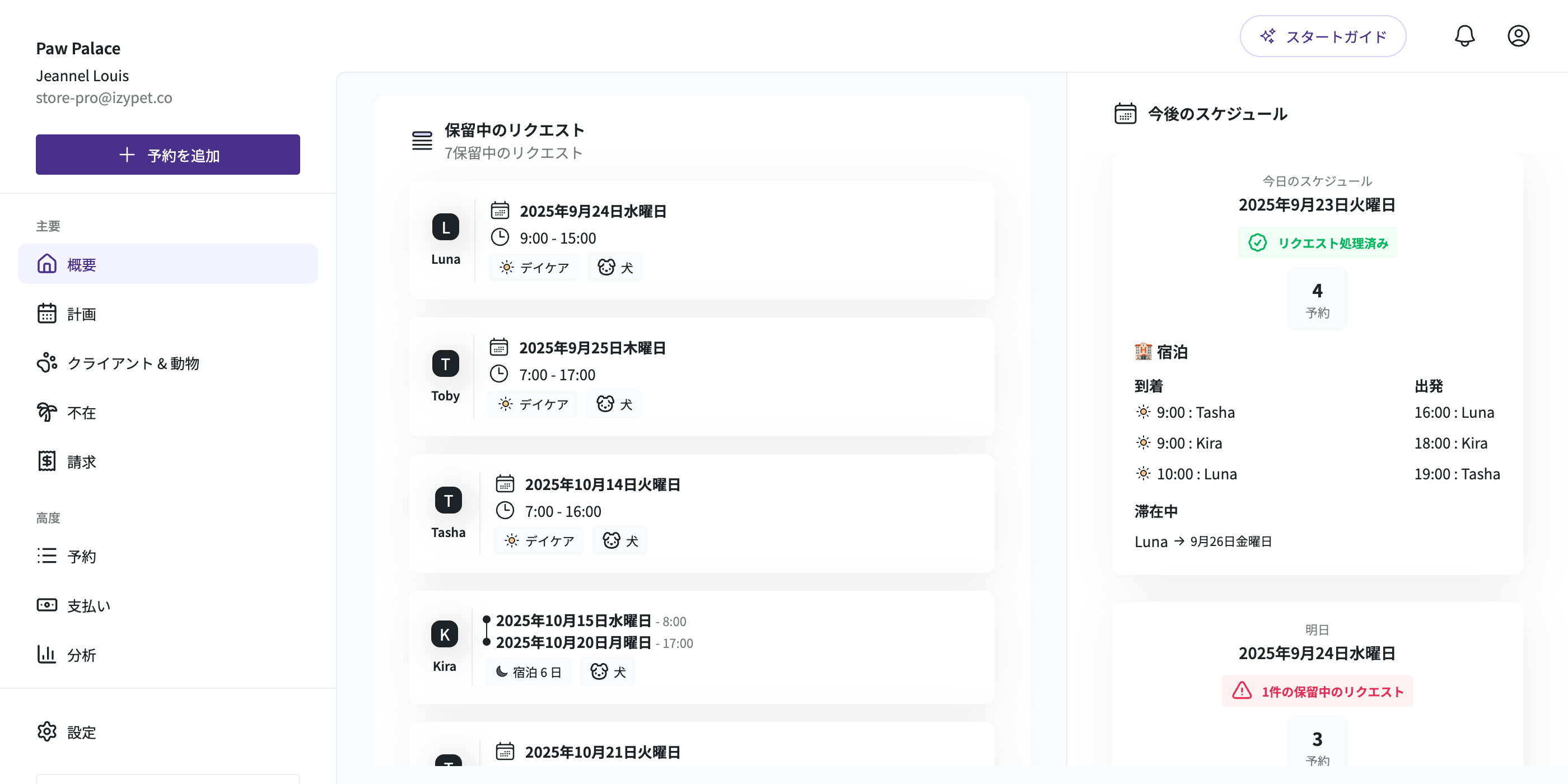 予約契約書は、利用条件を明確にし、ビジネスを保護するための重要なツールです。IzyPetを使えば、この手続きが迅速かつ簡単になり、大切なこと—お客様とそのペットのお世話—にもっと時間を割くことができます。